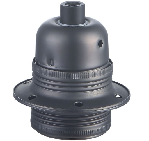 Halo Design Combi Fatning – SortFatning i flot sort larkering som leveres med ledningsaflaster (dutten på toppen som strammer om ledningen), og 2 ringe som kan skrues af og på, så du f.eks. kan sætte en skærm på fatningen. (Læs mere)